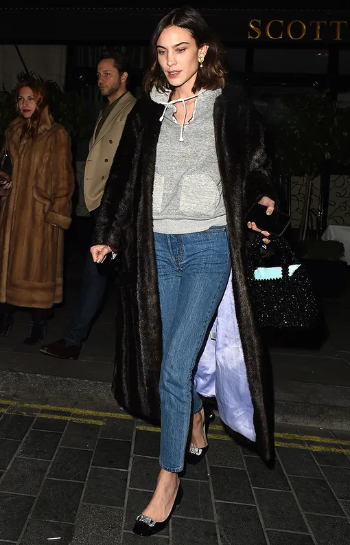14 января Алекса Чанг отправилась на ужин в один из лондонских ресторанов вместе с компанией друзей. Старательно продумывать наряд для этого события модница не стала: кажется, что она просто надела все любимые вещи разом. «Бабушкину» шубу до пят с шелковой подкладкой лавандового цвета, удобные джинсы из темного денима, худи с карманами на животе и кожаные черные туфли на невысоком каблуке с отделкой из камней. Финальным штрихом образа выступила мерцающая черная сумка-корзинка. И кто бы мог подумать, что все эти вещи будут отлично смотреться вместе?