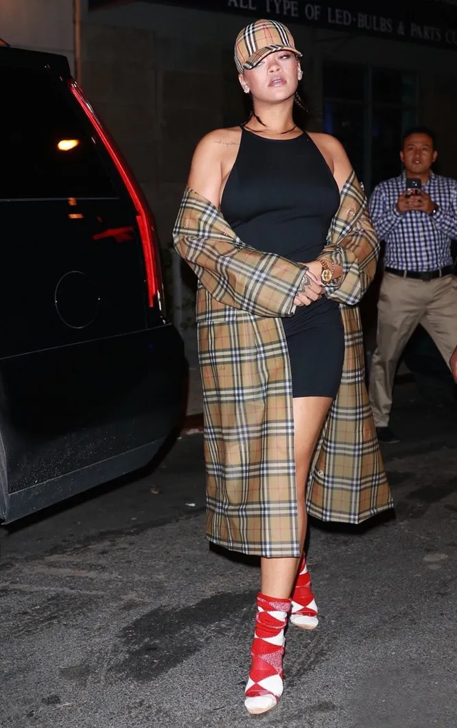 Тренч Burberry в клетку и маленькое черное платье — казалось бы, именно так выглядит спокойная классика. Но все меняется, когда за дело берется Рианна: певица даже самым классическим предметам гардероба дарит новое прочтение. Рири прогулялась по осеннему Нью-Йорку в черном облегающем мини — слишком смелом по меркам Коко Шанель, а сверху небрежно накинула тренч Burberry, чтобы все могли полюбоваться ее заметно постройневшей фигурой. На случай дождя Рианна захватила с собой бейсболку под стать плащу, ну а главным акцентом стали прозрачные босоножки в сочетании с теплыми красно-белыми носками — все-таки октябрь на календаре, да и мама может просматривать хроники стритстайла и волноваться.