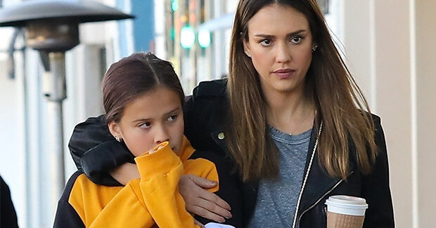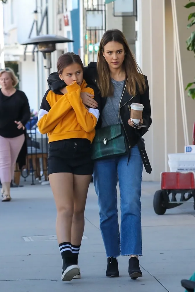 Классическое комбо: Джессика Альба в джинсах и кожаной куртке на прогулке с дочерью