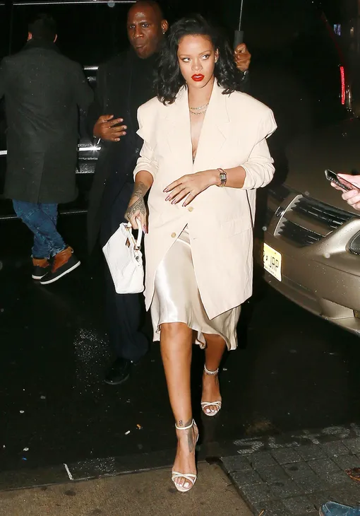 Несмотря на барбадосские корни, Рианна отлично чувствует себя в промозглом Нью-Йорке и даже в январе не думает слишком утепляться по пути на одну из местных вечеринок. Папарацци запечатлели Рири, когда та шла по мокрой от дождя и снега улице в образе в духе 1980-х: в кремовом платье-комбинации миди-длины, поверх которого накинула свободный жакет из хлопка. Дополнили образ белоснежная сумка из кожи рептилии, открытые босоножки на тонких ремешках (мама Рианны наверняка не одобрила выбор дочери) и алая помада — идеальный расслабленный вечерний выход!