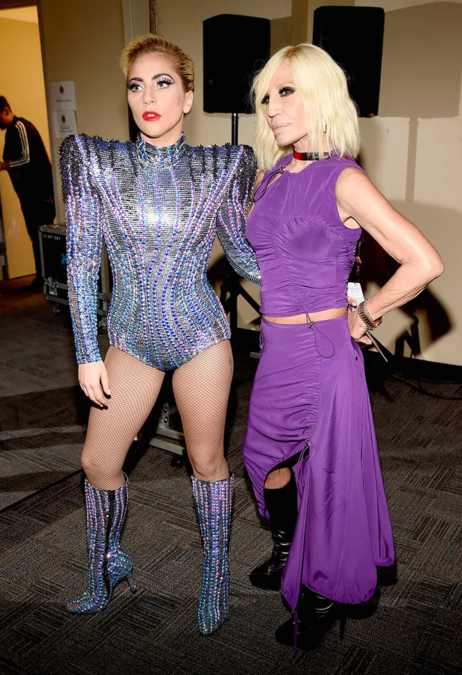 Из последних Донателла Версаче сложила полноценную концертную гардеробную капсулу. Ее открыло powershoulder-боди с высокими сапогами и чулками в сетку в духе ранних перформансов певицы, которое после дополнило золотое болеро с шипованными эполетами, а затем сменили блестящие шорты и кроп-топ. К слову, о том, в чем Гага появится на сцене Super Bowl — 2017, стало известно за несколько часов до выступления, когда автор костюмов принялась спойлерить снимками в Instagram (Социальная сеть признана экстремистской и запрещена на территории Российской Федерации) Atelier Versace.