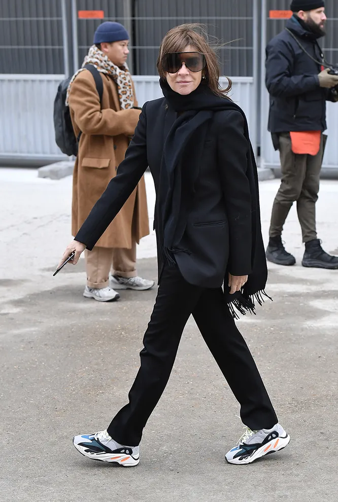 Главреда CR Fashion Book, по совместительству международный директор моды The Symbol и экс-глава французского Vogue Карин Ройтфельд по праву принадлежит титул самой стильной француженки, однако если вы внимательно присмотритесь к ее гардеробу, то увидите, что в нем нет ничего из ряда вон выходящего. Карин из года в год эксплуатирует одни и те же классические офисные фасоны - узкие юбки, приталенные жакеты и строгие двубортные пальто - и ставит на детали в ключе, как она сама это назвает, «грязноватого шика» вроде ажурных чулок, корсетной шнуровки и ботфортов на шпильках. Или лодочек — тоже на шпильках. Или ботильнов — разумеется, на шпильках. Проще говоря, что бы ни надела Карин, комплект всегда дополняют высокие каблуки, которые придают любому образу элегантного шика и соблазнительной женственности. Надо отдать ей должное — в эпоху, когда миром правит стритвир, Карин до последнего держалась за любимые шпильки, но накануне в пестрой толпе гостей парисжкой недели моды уличные фотографы впервые запечатлели нашу героиню... в кроссовках! Гулять так гулять — Карин выбрала самую хайповую модель сезона - коллаборацию Adidas Originals Yeezy 700 Wave Runner 2018 из новой коллекции Канье Уэста, рекламную кампанию которой, к слову, сама и стилизовала. В попытка подыскать слова, чтобы прокомментировать случившееся, констатируем: мир моды больше никогда не будет прежним.