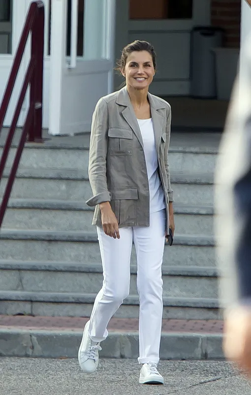Несмотря на высокий статус королевы Испании, Летиция, в первую очередь остается мамой двух прелестных дочерей: 12-летней Леонор и 11-летней Софии. Поэтому, отложив все монаршие дела, утром она отвозит детей в школу и выбирает для этого повседневный образ. Фотографы подловили королеву около учебного заведения, где учатся ее дети, без грамма макияжа, в белых джинсах, легком жакете в стили милитари и кроссовках. Ничто человеческое королевам не чуждо.