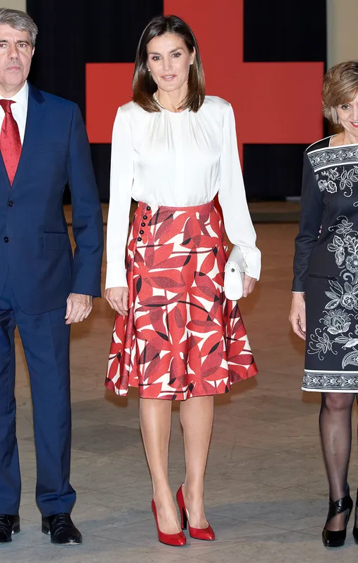 Не только Кейт Миддлтон не боится надевать одни и те же вещи несколько раз: королева Испании Летиция дала второй шанс миди-юбке Carolina Herrera А-силуэта с ярким цветочным принтом. Добавив к ней белую шелковую блузку Hugo Boss с манжетами и алые лаковые лодочки на высоком каблуке, супруга короля Филиппа VI отправилась на мероприятие в честь столетия школы медсестер при Центральном госпитале Cruz Roja в Мадриде.