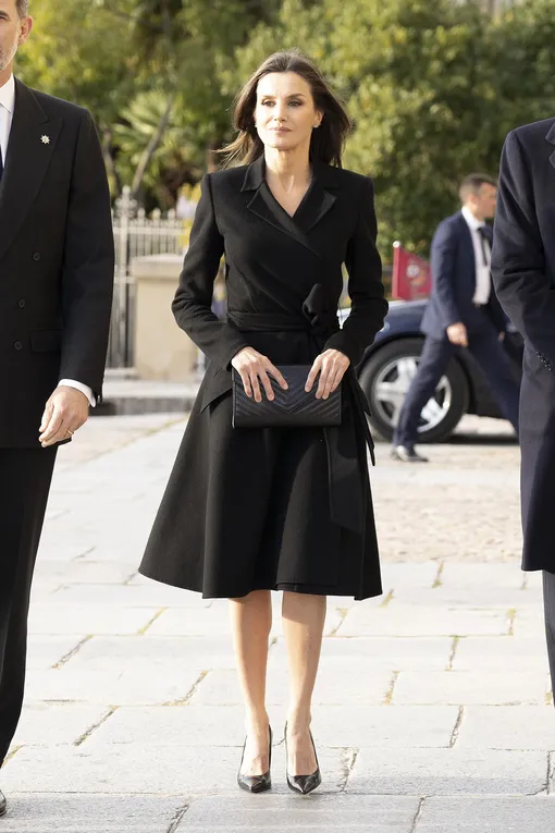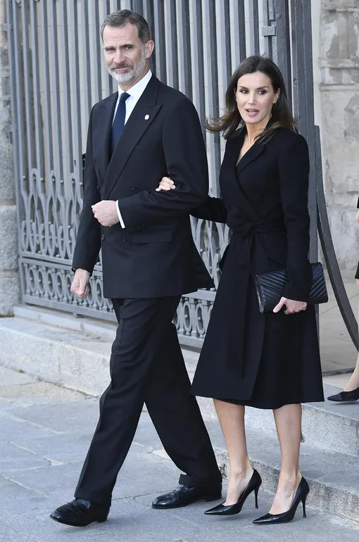 Монаршие особы посещают не только праздничные и торжественные приемы - порой им приходится принимать участие в траурных мероприятиях. К примеру, на днях король Филипп VI и королева Летиция проводили в последний путь экс-министра иностранных дел Испании Хосе Педро Переса-Льорку Родриго. На отпевание, прошедшее в церкви Св. Иеронима в Мадриде, первая леди прибыла в черном пальто Carolina Herrera, лодочках от испанского бренда Magrit и с прямоугольным клатчем Felipe Varela. Все эти марки можно смело назвать любимыми для нашей героини, а вещи от Фелипе Варелы Летиция носит даже вопреки общественному мнению, несмотря на обвинения дизайнера в плагиате.
