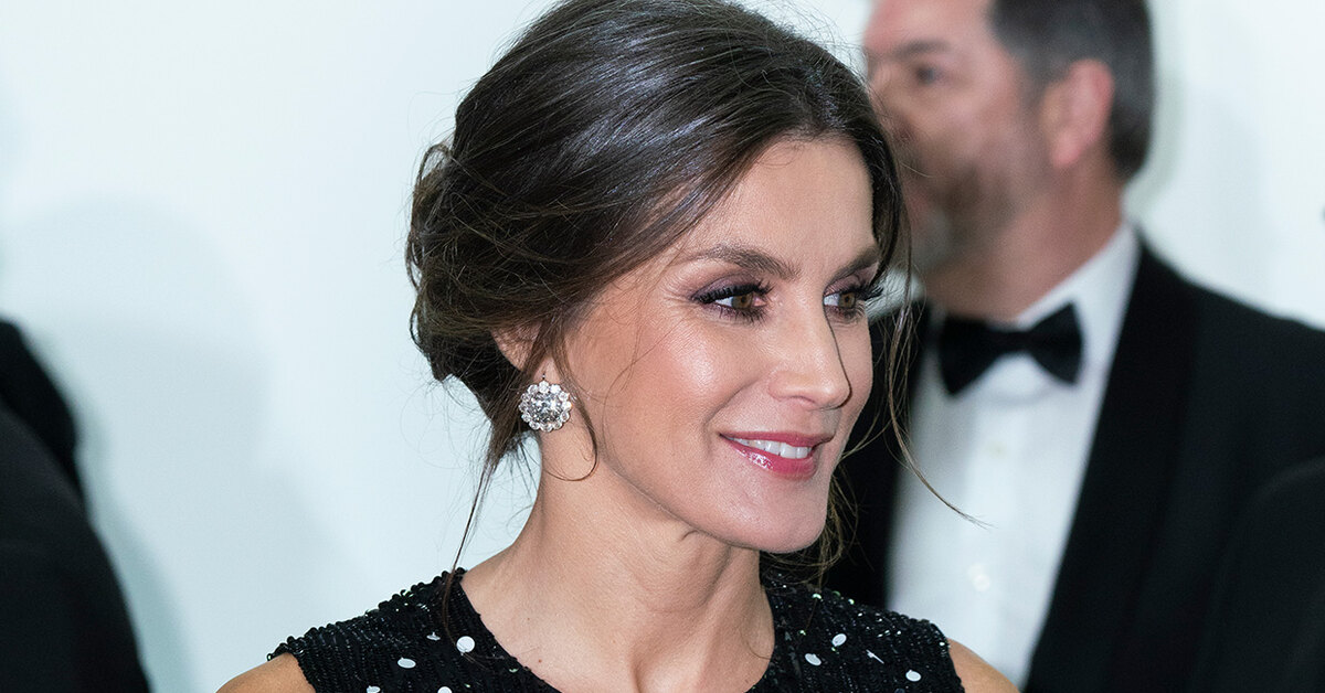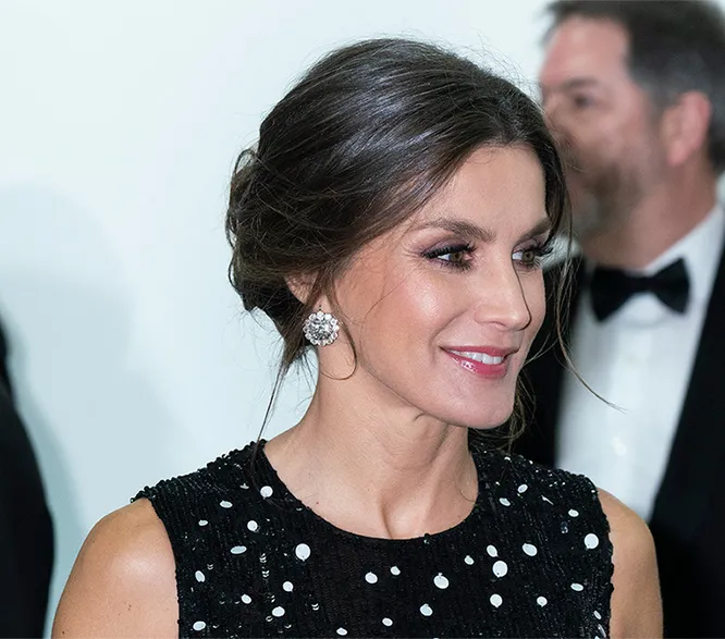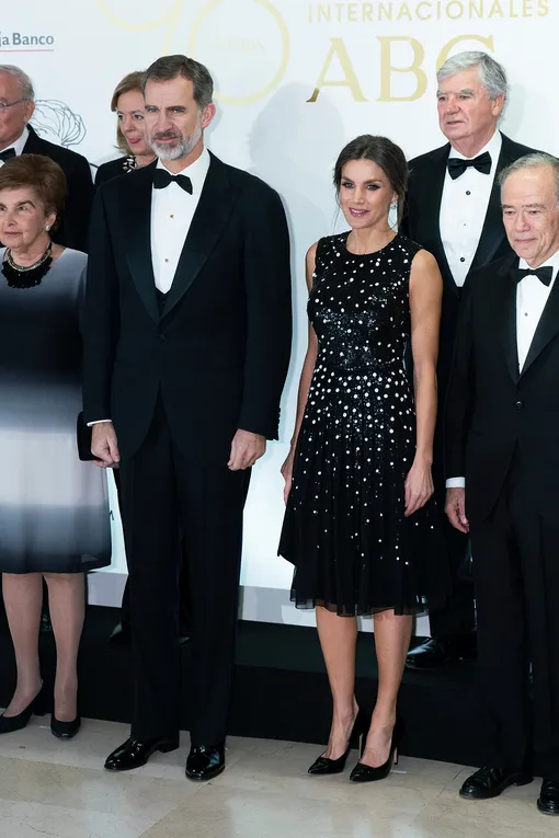 Оставив одежду из масс-маркета до менее торжественных поводов, для своего нового выхода королева Летиция выбрала дизайнерское платье. Первой леди Испании приглянулось черное миди-платье Carolina Herrera с многослойной юбкой, усыпанное белыми пайетками и напоминающее зимнее ночное небо: именно в нем наша героиня за компанию с супругом отправилась на вручение журналистских премий имени выдающихся испанских деятелей в этой области — Минготе, Хуана Игнасио Люка Де Тены и Мариано де Кавиа. К своему образу Летиция добавила лодочки от итальянского бренда Lodi и броские серьги, ради которых супруга короля Филиппа VI даже сделала высокую прическу.