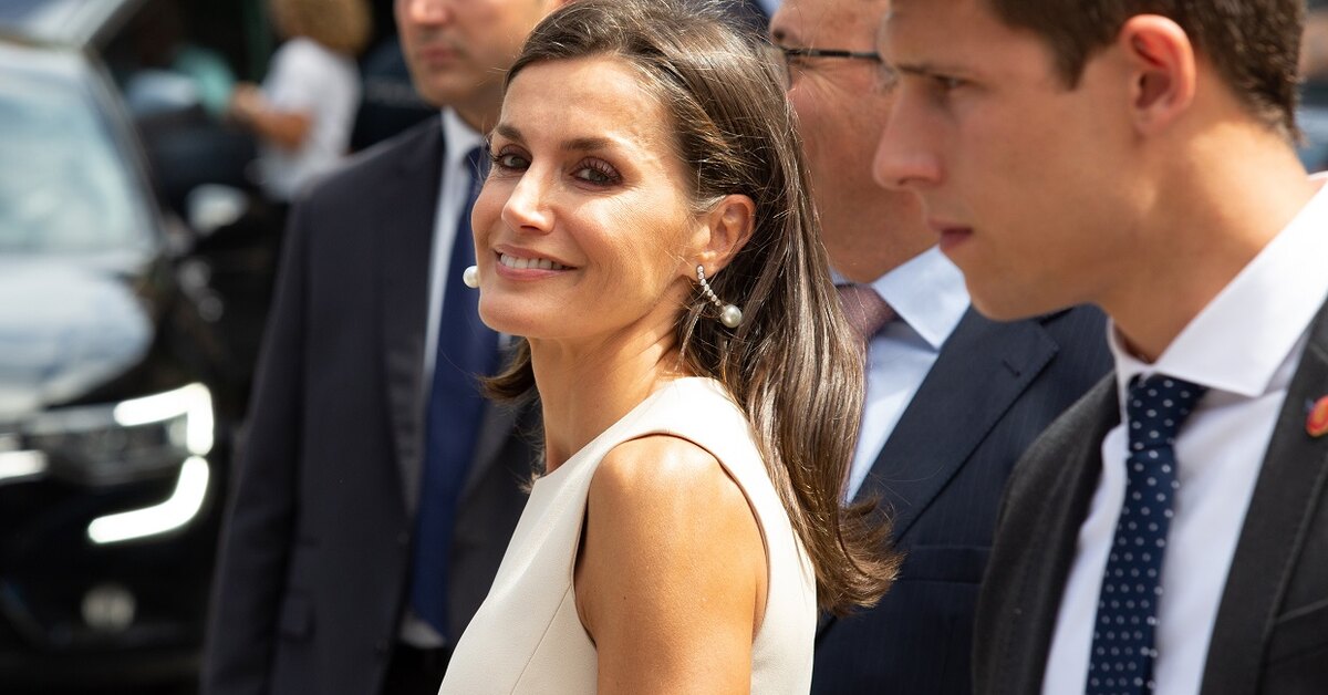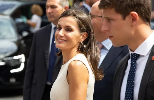Испанская королевская семья прибыла в Севилью, чтобы отпраздновать 500-летнюю годовщину Первой кругосветной экспедиции Элькано и Магеллана. Летиция выбрала для официального выхода платье кремового оттенка марки Pedro del Hierro, которое дополнила двухцветной сумкой из мягкой кожи и лодочками карамельного оттенка с открытой пяткой. А длинные серьги с крупной жемчужиной на конце стали главным акцентом образа.