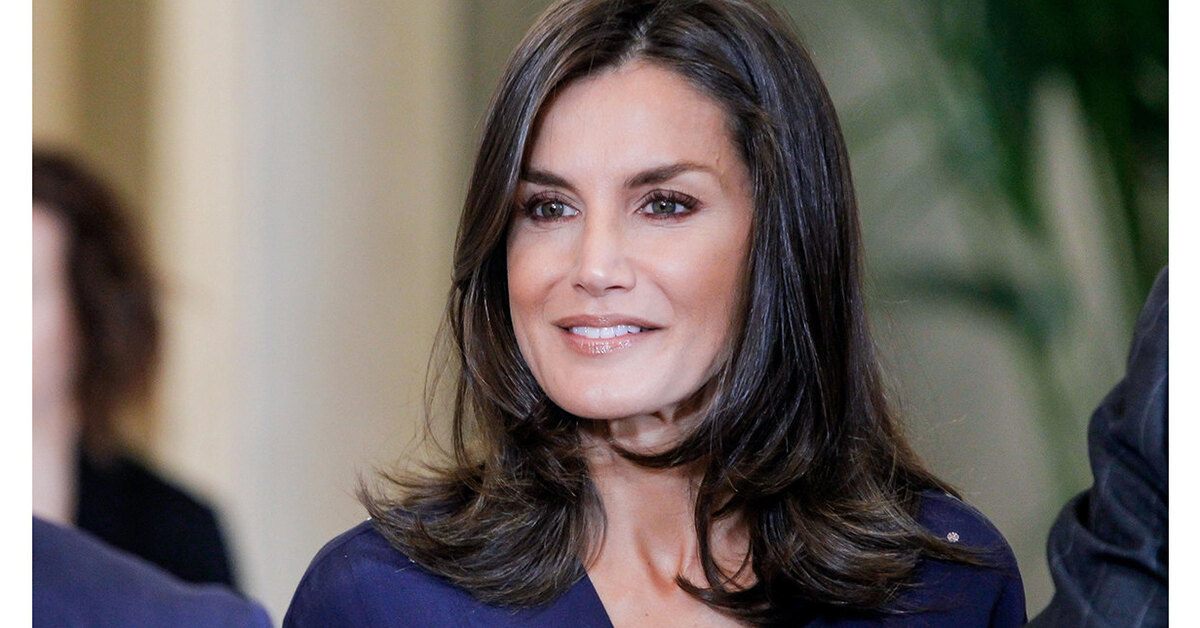 Королева Летиция в платье Maje сложного синего оттенка на приеме во дворце Сарсуэла