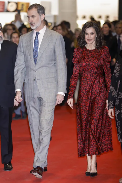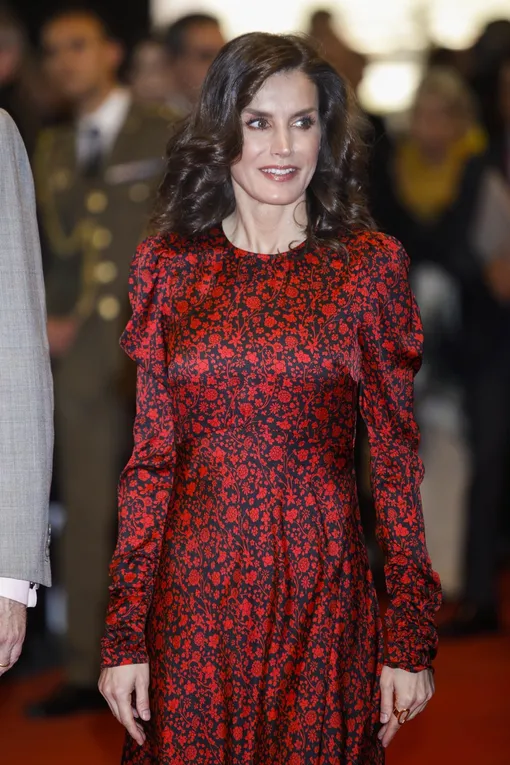 Супруга Филиппа VI надела атласное платье в пол черного цвета с алым цветочным принтом. Наряд она дополнила неизменными черными лодочками. Платье Maje облегающего силуэта выгодно подчеркнуло точеную фигуру Летиции.