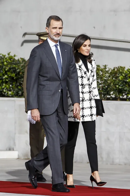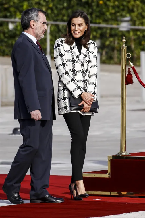 В минувший понедельник Ее Величество с супругом королем Филиппом VI приняла участие в специальной государственной церемонии в аэропорту Мадрида, перед тем как отправиться на Кубу. На мероприятии Летиция появилась, как всегда, с шиком. Соблюдая строгий дресс-код, но не забывая о стиле, она надела базовую черную водолазку и узкие брюки в тон в комплекте с блейзером Uterqüe с принтом «гусиная лапка»: королева активно поддерживает испанские бренды. Завершающим штрихом стал клатч-конверт и лодочки Prada.