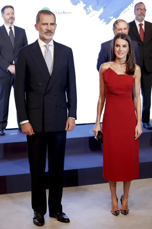 Первая леди Испании предстала на гала-вечере во всеоружии. Она надела красное платье бюстье Roberto Torreta с эффектным асимметричным верхом. Облегающий силуэт подчеркнул осиную талию нашей героини и выделил ее стройные длинные ноги. Свой яркий вечерний наряд Летиция дополнила лаконичными черными лодочками Manolo Blhanik и клатчем Bottega Veneta. Королева не любит яркие аксессуары, предпочитая смещать акценты в сторону самого наряда: так и на этот раз она выбрала только лаконичные серьги Aldao Joyeros.