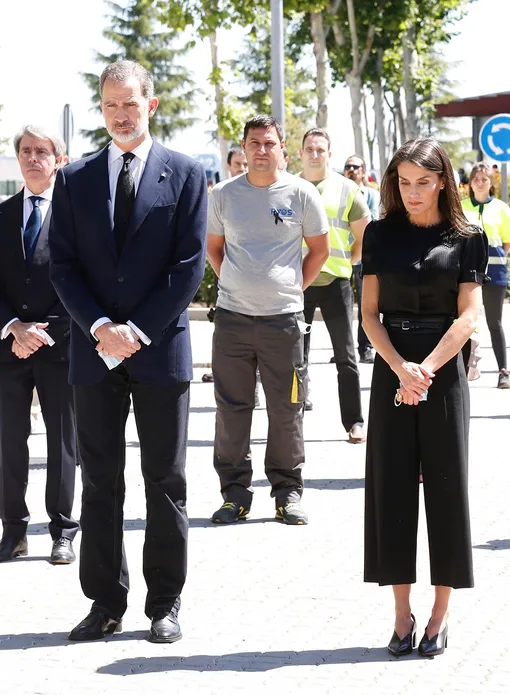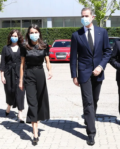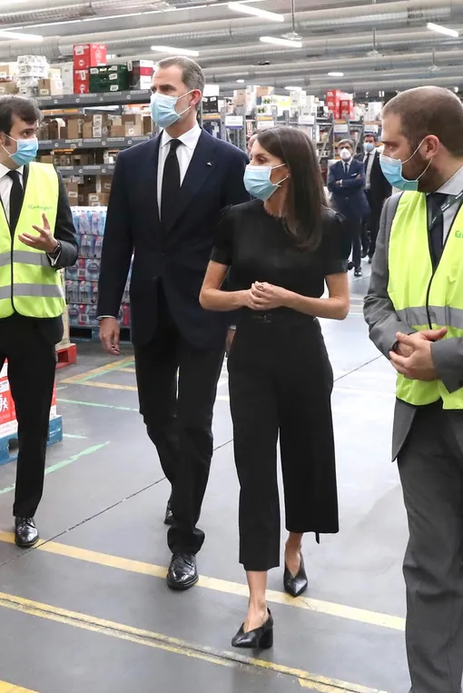 Испанские монархи перестали соблюдать карантин и вернулись к официальным обязанностям после не менее активной работы в онлайне в разгар пандемии. Король Филипп VI вместе с супругой после поездки в Сан-Мартин-де-ла-Вега отправились в город Кослада — монаршая чета посетила местный транспортный центр, обеспечивающий логистику в это непростое время. Королева Летиция осталась верна любимому сочетанию total black и выбрала для выхода черный топ с кружевным воротом и рукавами-фонариками (на этот раз не просвечивающий), кюлоты со стрелками и остроносые кожаные туфли на устойчивом блочном каблуке. Верх из шелка и укороченные брюки нечасто встретишь в гардеробах первых леди, но главная модница Испании всегда изящно выходит за рамки строгого дресс-кода.