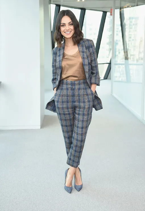 Костюм в клетку и шелковый топ: Мила Кунис в идеальном деловом образе