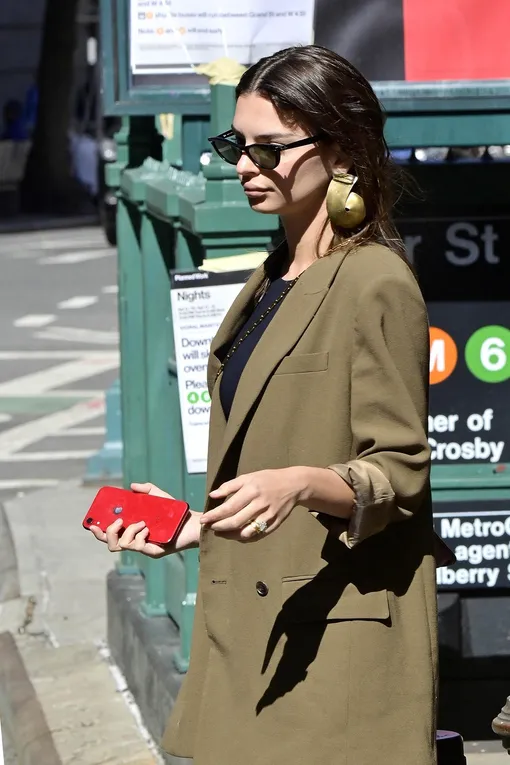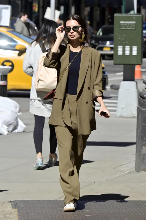Если рядом нет супруга Себастьяна Бир-МакКларда, Эмили Ратаковски выбирает образы поспокойнее и делает ставку на расслабленный кэжуал. Вчера модель предпочла отправиться на прогулку по Нью-Йорку в брючном костюме. Рукава блейзера Эмили небрежно подвернула, чтобы следовать главному модному правилу: надеваешь оверсайз — обнажай самые тонкие части тела. Белые кеды и черный топ составили компанию двойке в оттенке хаки, а в качестве акцента выступили массивные серьги-завитушки: надеемся, на деле они не такие тяжелые, какими выглядят внешне — хотя каждая фэшиониста готова идти на небольшие жертвы, если того требует капризная мода.