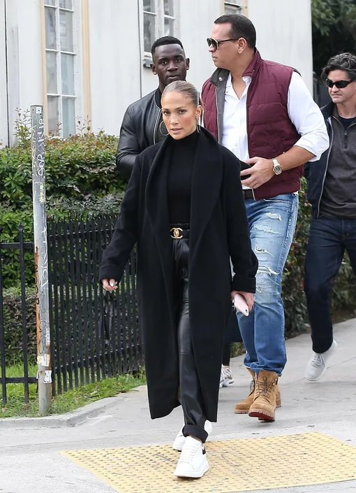 Тяжело быть иконой стиля: даже на воскресную прогулку с возлюбленным приходится выходить в образе, продуманном до мелочей, — папарацци ведь точно составят вам компанию. Впрочем, Дженнифер Лопес такое положение вещей не напрягает: дива привыкла не обращать внимания на незваных гостей. Они-то и запечатлели артистку ранним утром на свидании с Алексом Родригесом в Голливуде. Дженнифер выбрала для прогулки аутфит в палитре total black: уютное пальто-халат, лонгслив, кожаные брюки Balmain с подворотами и ремень Chanel с золотой пряжкой. Лишь обувь контрастно отличалась от всего наряда: Лопес остановилась на белоснежных сникерсах Alexander McQueen.