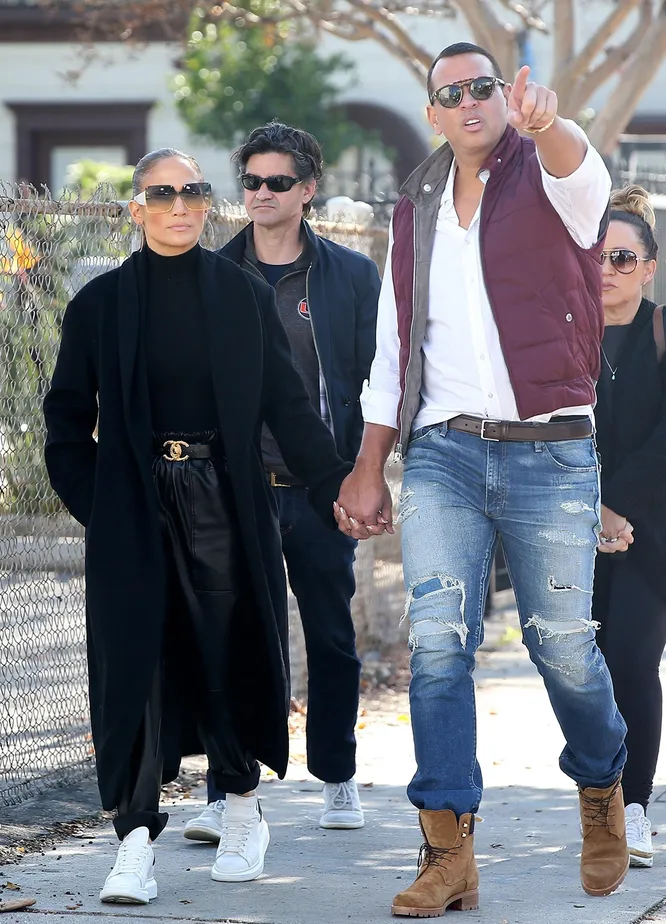 Тяжело быть иконой стиля: даже на воскресную прогулку с возлюбленным приходится выходить в образе, продуманном до мелочей, — папарацци ведь точно составят вам компанию. Впрочем, Дженнифер Лопес такое положение вещей не напрягает: дива привыкла не обращать внимания на незваных гостей. Они-то и запечатлели артистку ранним утром на свидании с Алексом Родригесом в Голливуде. Дженнифер выбрала для прогулки аутфит в палитре total black: уютное пальто-халат, лонгслив, кожаные брюки Balmain с подворотами и ремень Chanel с золотой пряжкой. Лишь обувь контрастно отличалась от всего наряда: Лопес остановилась на белоснежных сникерсах Alexander McQueen.