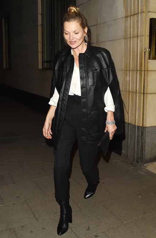 Кейт Мосс умеет выбирать нестандартную верхнюю одежду. В арсенале супермодели есть несколько бархатных пальто, в том числе декорированных жемчужинами. А теперь к ним добавился еще и черный кейп из кожи: свою новую эффектную вещь Кейт выгуляла на вечеринке в честь дня рождения подруги в одном из ресторанов Лондона. Распахнутый кейп Мосс накинула поверх белой сорочки с подкатанными рукавами и брюк с высокой посадкой и дополнила образ ботильонами на каблуке, клатчем из мягкой кожи и широким браслетом с бриллиантами.