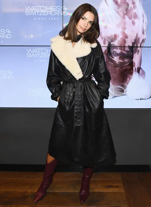 Мы привыкли, что Эмили Ратаковски любит откровенные образы и минимум одежды, которая едва прикрывает ее соблазнительную фигуру. Однако на этот раз модель и актриса неожиданно решила позировать на красной дорожке даже не снимая верхней одежды. Эмили стала гостьей вечера швейцарского бренда Watches of Switzerland в Нью-Йорке, на который она пришла в бордовых сапогах на высоких шпильках и черном кожаном плаще с воротником из овчины. В такой утепленной модели тренча можно провести всю зиму, а выглядит он интереснее обычных пальто и пуховиков — берем идею Ратаковски на заметку!