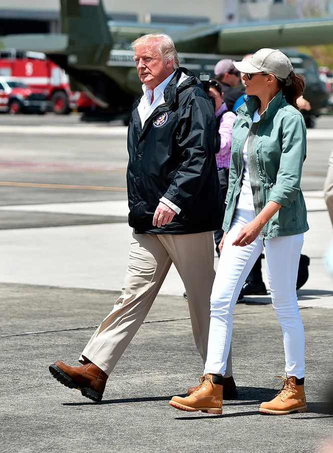 Вчера 47-летняя Мелания Трамп прилетела вместе с мужем в Пуэрто-Рико, чтобы встретиться с жителями районов, пострадавших от самого сильного за последние 90 лет урагана. С трапа самолета первая леди США вышла в белоснежных джинсах и такой же светлой футболке, военной куртке с карманами — карго и удобных ботинках Timberland. Все же Мелания из тех, кто учится на своих ошибках: больше на шпильках в зону бедствия она не приезжает.