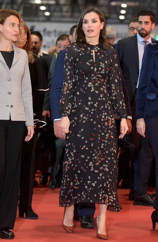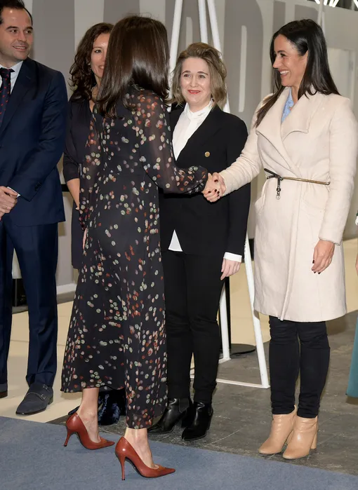 Уже третья за сегодня звездная модница делится образом от бюджетного бренда Massimo Dutti: Меган Маркл вспомнила, как посещала приют для животных в пальто этой марки, Кейт Миддлтон в демократичной верхней одежде отправилась в Кардифф, а теперь и королева Летиция вышла в свет в платье от соотечественников. Первая леди Испании приняла участие в Международной туристической выставке, куда прибыла в облегающем платье с полупрозрачными рукавами. К нему супруга короля Филиппа VI подобрала кожаные лодочки Magrit в насыщенном карамельном оттенке — одном из главных цветов 2020 года.