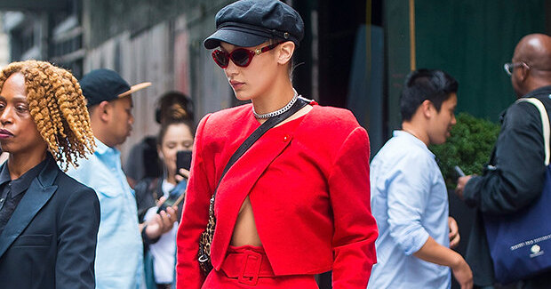 Короткая алая юбка с широким ремнем на талии и укороченный пиджак, открывающий верхнюю часть живота, — к такому костюму большинство бы надело классические лодочки на небольшом каблуке и массивные золотые украшения, чтобы и в 2017 году испытать на себе лютую роскошь стиля героев сериала «Династия». Но не Белла Хадид. Ей по душе современный спортшик, поэтому в пару к алой двойке она выбирает кроссовки Nike и кожаную кепку. Мы одобряем.