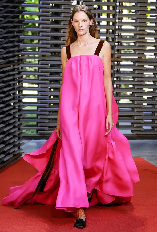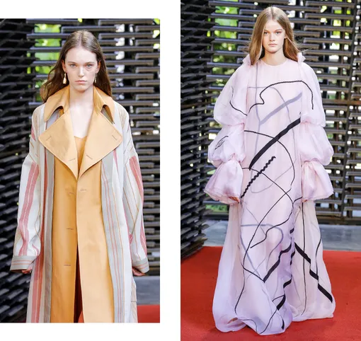 Самый первый, с двухслойным пальто-трансформером: верхнюю часть можно отстегнуть – и получится что-то вроде легкого кимоно в полоску. Еще два очень ярких платья, розовое и красное, из заключительной части показа – они как внезапные вспышки цвета в достаточно сдержанной палитре. И наконец, образы с графичными принтами, которые я подсмотрела на гобеленах Ле Корбюзье. Я же говорила, что меня вдохновляет архитектура и архитекторы, – вот вам пример!