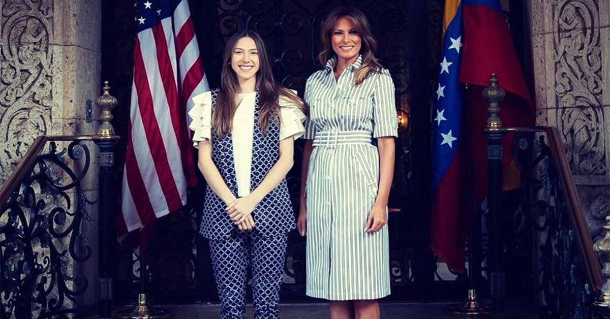 Несколько часов назад Мелания Трамп устроила встречу в Белом доме с Фабианой Росалес, политической активисткой и супругой венесуэльского оппозиционера Хуана Гуайдо. Первая леди США появилась перед гостьей в белом платье-рубашке Derek Lam в полоску — этот фасон давно стал одним из любимых для супруги Дональда Трампа. А дополнили образ Мелании лодочки Manolo Blahnik в пепельном или «мышином» оттенке.