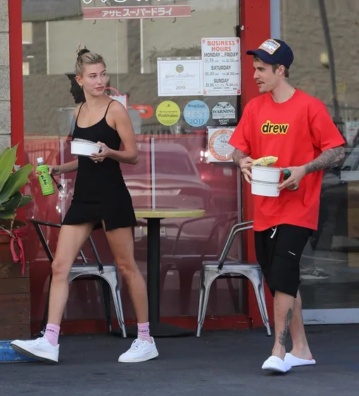 Маленькое черное платье и дизайнерские носки: Хейли Бибер на свидании с мужем