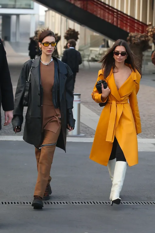 Черные скинни и белые ботильоны идеально завершили ее наряд. Брюнетка в таком образе отправилась на выставку Fondazione Prada. Компанию ей составила Белла Хадид, которая сделала ставку на ансамбль в стиле 90-х. Модель надела коричневый топ с мини-юбкой и брюками в тон. На плечи звезда накинула кожаную жилетку и черный «папин» плащ.