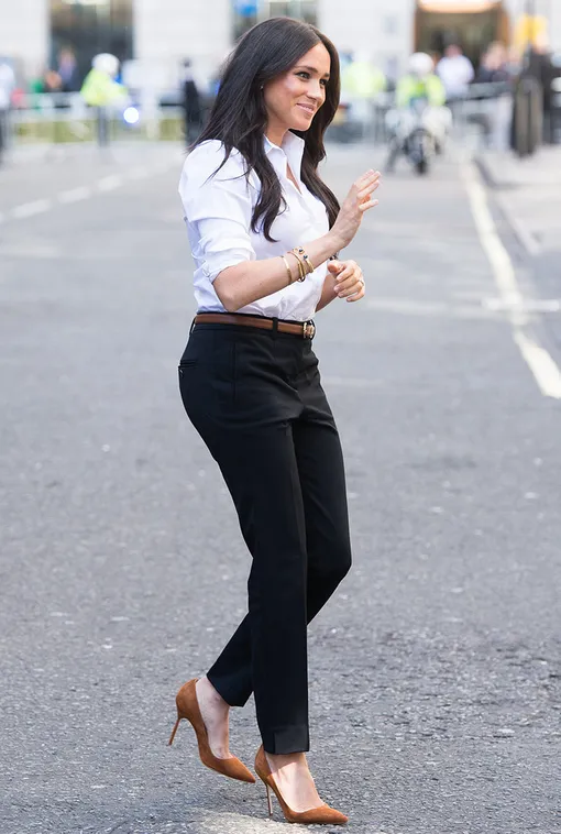 Меган Маркл в серьгах принцессы Дианы и рубашке из своей дебютной коллекции в Лондоне