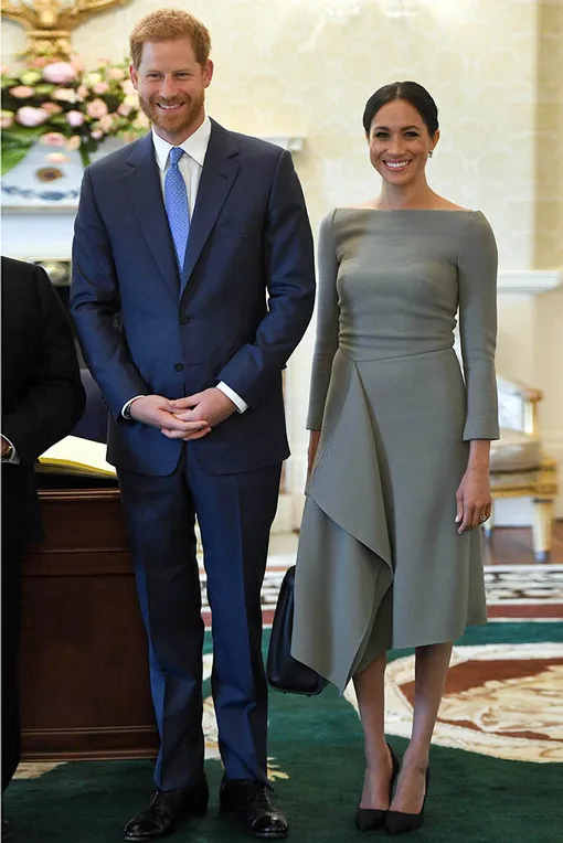 Меган Маркл и принц Гарри завершили свой официальный двухдневный визит в Ирландию встречей с президентом страны Майклом Хиггинсом и его супругой Сабиной Койн. Несмотря на то что герцогиня Сассекская уже убедила нас, что безупречно держится на официальных мероприятиях и достойна звания новой иконы дипломатического дресс-кода, встреча с первым лицом государства даже для нее событие не из рядовых. Но Меган и тут оказалась на высоте, продемонстрировав, как выглядеть сдержанно и строго, но нескучно. Для очередного выхода супруга принца Гарри выбрала платье Roland Mouret самого нейтрального из всех возможных оттенков - графита, но даже серое платье не превратило ее в серую мышку. Спасибо облегающему фасону наряда, подчеркнувшему точеную фигуру Меган, элегантному вырезу «лодочкой», добавившему образу очаровательной хрупкости, и асимметричному крою подола, не позволившему платью остаться незамеченным!
