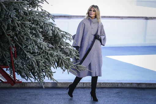 Мелания встретила прибытие праздничной елки, которую подвезла повозка с двумя лошадьми. Наша героиня под звуки духового оркестра позировала рядом, хотя все прекрасно помнят ее отношение к зимним праздникам. Хакеры перехватили телефонный разговор, в котором жена президента жаловалась подруге. Она говорила, что Рождество на самом деле никому не нужно, но ей все равно приходится тратить свое время на декорации к этому. Впрочем, на официальных снимках Мелания выглядела чрезвычайно бодрой и довольной для человека, который ненавидит праздничные традиции. Первая леди дебютировала с новым окрашиванием: она стала блондинкой. Миссис Трамп надела оверсайз-пальто Balenciaga с узором «гусиная лапка», дополнив образ черными кожаными перчатками и высокими сапогами на каблуке. Идеальное сочетание для выхода накануне зимы.