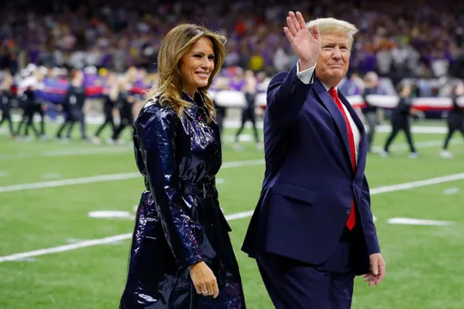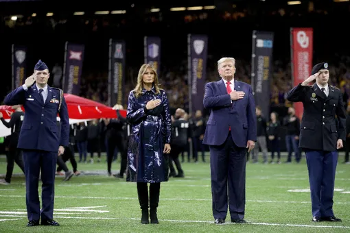 В минувший понедельник Дональд и Мелания Трамп посетили матч по американскому футболу между командами из колледжей. Первая леди США в очередной раз доказала, что ее не зря называют иконой стиля. Перед публикой Мелания появилась в темно-синем плаще с металлическими отливами, который послужил ей полноценным нарядом. Чтобы образ не получился вычурным, она дополнила плащ высокими сапогами из черной замши и обошлась без аксессуаров. Стоит отметить, что Мелания подобрала идеальную цветовую гамму: ее образ гармонировал с костюмом супруга и военной формой офицеров, но при этом выделял первую леди из всех. Супруга президента сделала свою фирменную прическу с легкими локонами и макияж с акцентом на глаза.