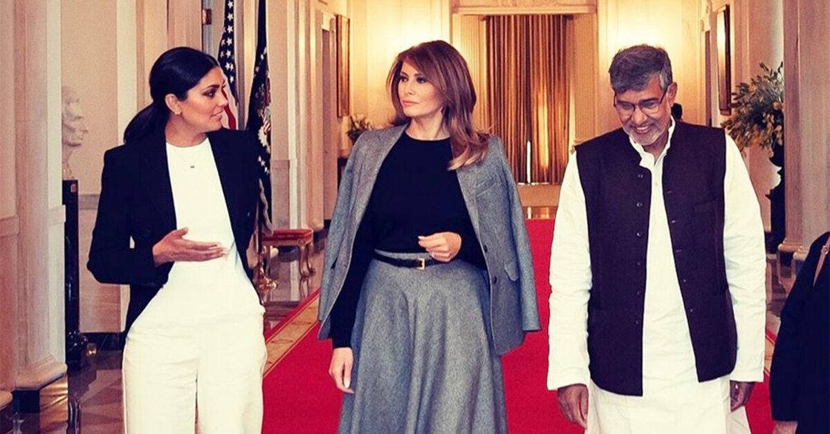 Не только Брижит Макрон поддерживает женщин-активисток: Мелания Трамп тоже следит за работой инициативных меценаток и помогает им привлечь внимание к проблемам общества. Несколько часов назад первая леди США встретилась с индийской защитницей прав детей и лауреатом Нобелевской премии мира Кайлаш Сатуарти и американским дизайнером Рэйчел Рой, которая помогает детям из малообеспеченных семей и выступает за гендерное равенство. Мелания приняла почетных гостей в своей официальной резиденции в Белом доме. Супруга Дональда Трампа выбрала довольно строгий образ: миди-юбку и жакет из серой шерстяной ткани, закрытый трикотажный топ и черные лодочки — похоже, она не хотела отвлекать внимание общественности от важных обсуждаемых вопросов, связанных с правами детей.