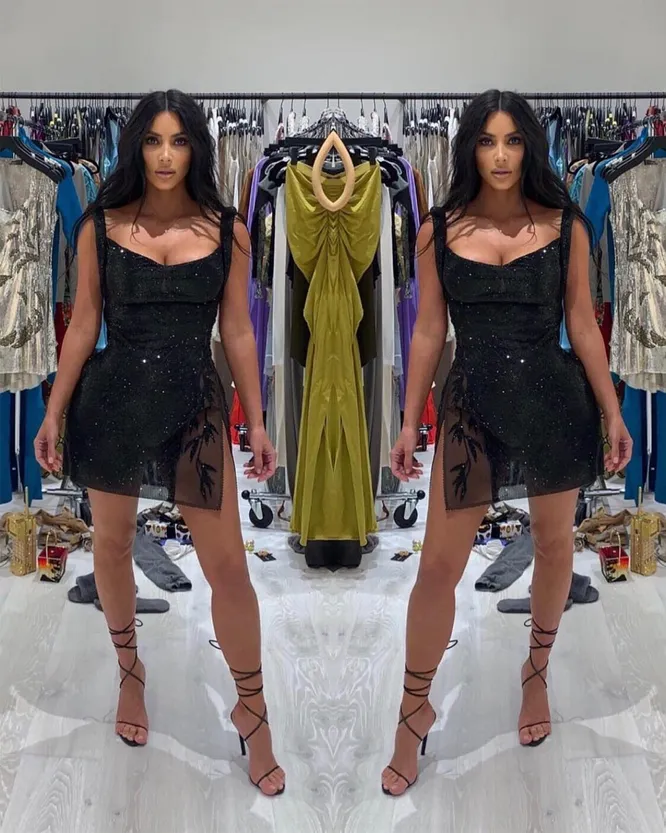 Ким Кардашьян славится своей любовью к винтажным платьям, и особенно сильно дива неравнодушна к шедеврам Versace. На днях семейство Кардашьян — Дженнер устроило шумную вечеринку в честь 40-летия Кортни, но Ким не стала следовать правилам приличия и явно захотела затмить именинницу. Супруга Канье Уэста выбрала для семейного празднования соблазнительный образ: ей приглянулось откровенное платье, созданное итальянским модным Домом в далеком 1997 году. Крошечное черное мини с разрезом, вышивкой со стеклярусом и прозрачной юбкой — неудивительно, что оно пришлось по душе нашей героине.
