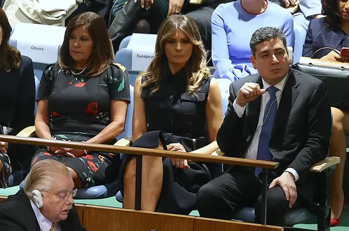Дональд и Мелания Трамп прибыли в Нью-Йорк, чтобы принять участие в 73-й сессии Генеральной Ассамблеи ООН. Минувшим вечером президент США выступил перед участниками Ассамблеи, а его супруга слушала речь из зала. Мелания попала в объектив фотографов мельком, но не заметить ее элегантный образ невозможно. Первая леди выбрала черное платье-рубашку без рукавов от Dior и классические лодочки.