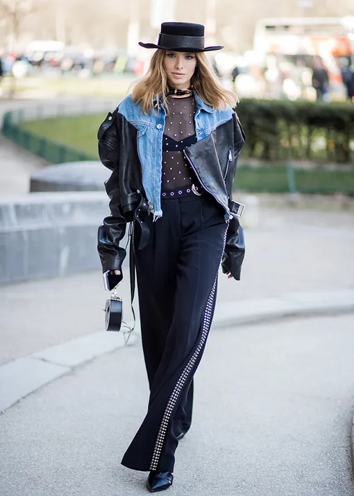 Хотя ливанский модный Дом Elie Saab воспевает подчеркнуто женственные образы и особенно славится своими платьями, на показе в рамках Недели моды в Париже Елена Перминова решила отличиться от моделей на подиуме в каскадах из кружева и шифона и предпочла им свободные брюки с высокой талией, прозрачный топ с разноцветными бусинами, джинсовый жакет с рукавами от косухи и — в качестве главного акцента — черную ковбойскую шляпу.