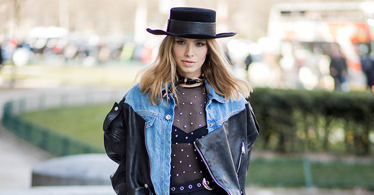 Хотя ливанский модный Дом Elie Saab воспевает подчеркнуто женственные образы и особенно славится своими платьями, на показе в рамках Недели моды в Париже Елена Перминова решила отличиться от моделей на подиуме в каскадах из кружева и шифона и предпочла им свободные брюки с высокой талией, прозрачный топ с разноцветными бусинами, джинсовый жакет с рукавами от косухи и — в качестве главного акцента — черную ковбойскую шляпу.