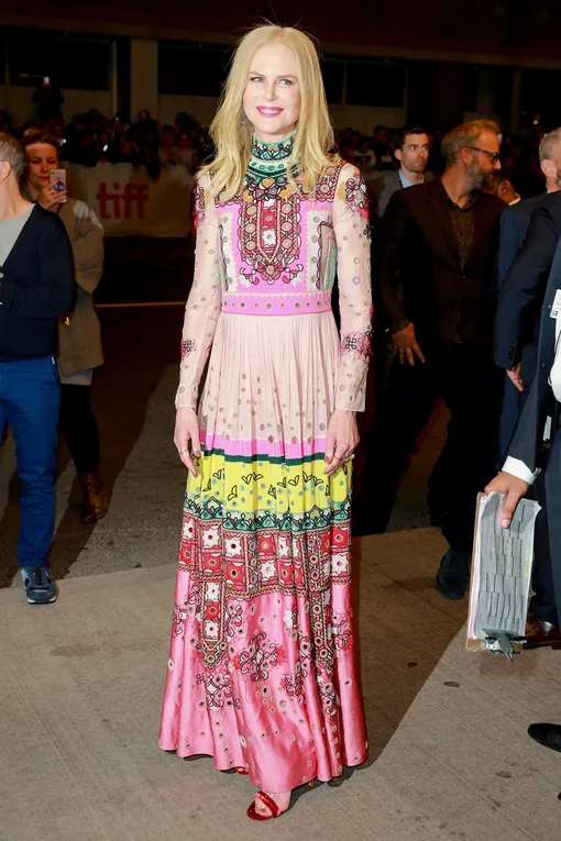 Минувшим вечером на Международном кинофестивале в Торонто состоялась премьера картины греческого режиссера Йоргоса Лантимоса «Убийство священного оленя». Звездой вечера стала исполнительница главной женской роли – 50-летняя Николь Кидман. Для выхода в свет актриса выбрала эффектное платье Valentino в стиле этно. Образ дополнили бархатные туфли розового цвета.