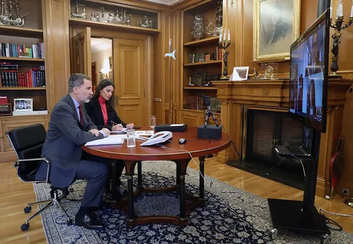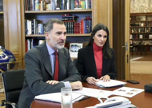 В разгар пандемии коронавируса монархи и политики переходят в режим онлайн. Как и Кейт Миддлтон, королева Летиция ведет переговоры по телефону и участвует в видеоконференциях совместно с супругом, королем Филиппом VI. Вчера королевская чета пообщалась c бизнесменами из Овьедо, административного центра автономного сообщества Астурия, а после поделилась снимками «встречи» из рабочего кабинета во дворце Сарсуэла. Даже во время изоляции первая леди Испании не забыла о сочных оттенках и выбрала для конференции водолазку в малиновой палитре в паре с черным деловым костюмом. Лишь только любимые лодочки модница заменила комфортными мокасинами.