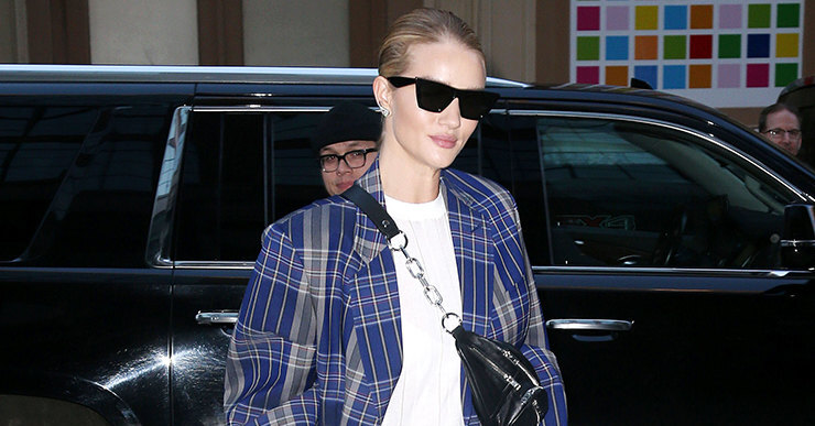 Несмотря на любовь к обтягивающим вещам, Роузи Хантингтон-Уайтли тоже не смогла устоять перед общей тягой к оверсайзу и отправилась на прогулку по Лос-Анджелесу в объемном пиджаке Acne Studios в клетку с «мужского» плеча. А чтобы уравновесить объемный верх, модель дополнила образ светлым облегающим топом, черными брюками Helmut Lang в облипку и узкими ботильонами Céline с кожаными носами — этот прием не только сработал на контрасте, но и позволил еще больше «удлинить» ноги нашей героини. Берем ее идею на заметку!