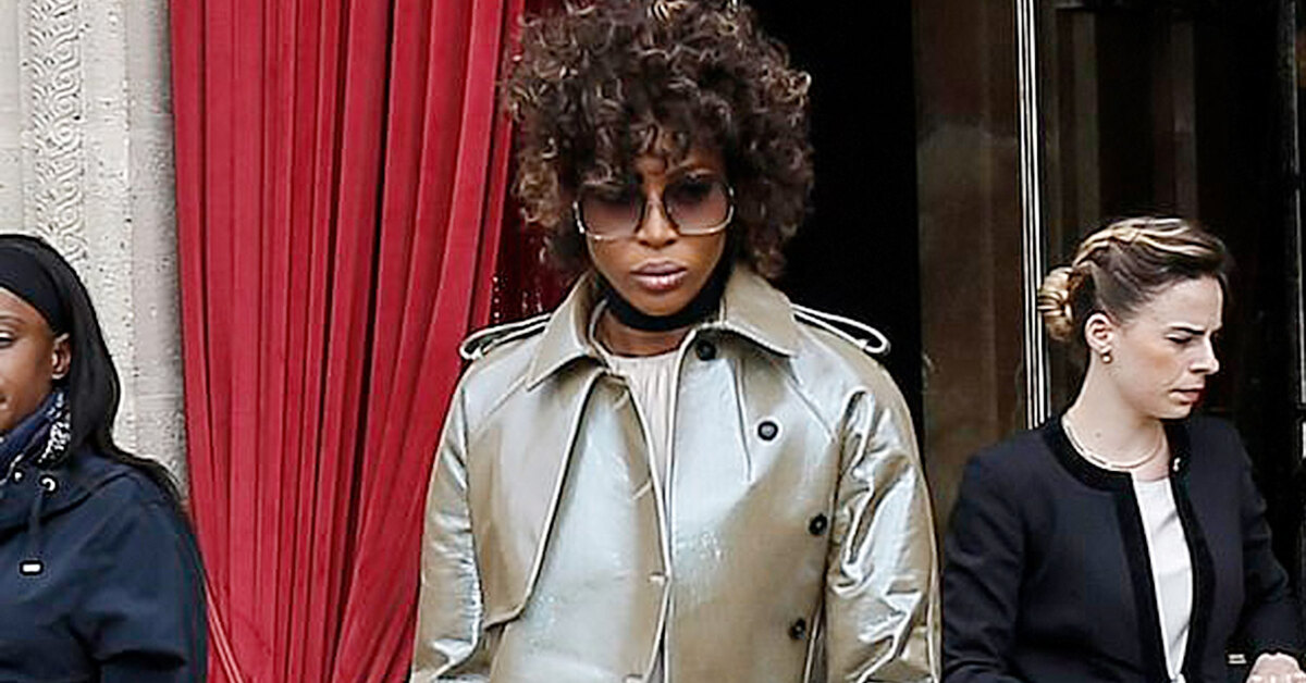 Наоми Кэмпбелл в оливковом тренче, прозрачном платье и сапогах под змею гуляет по Парижу
