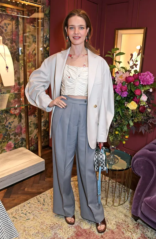 Наталья Водянова тоже не смогла остаться равнодушной к свободным костюмам «мужского» кроя, которые отныне есть в гардеробе каждой фэшиониста. Модель посетила презентацию ювелирной коллекции в Лондоне, которую благотворительный фонд «Обнаженные сердца» создал вместе с брендом Chopard, в сером жакете с покатыми плечами и широкими рукавами и свободных брюках с защипами от Acne Studios. Наталья сыграла на контрасте и дополнила двойку коротким корсетным топом в молочном оттенке. Финальными штрихами стали сумка Louis Vuitton в клетку, кожаные босоножки с тиснением под рептилию и украшения с сердцами из совместной коллекции.