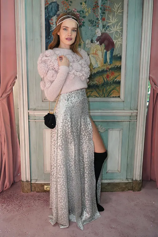 Ульяна Сергеенко презентовала в Париже новую коллекцию. Поддержать дизайнера пришла ее подруга и соотечественница Наталья Водянова. Российская супермодель, которая не так давно стала невестой, по традиции позировала в тотал-луке Ulyana Sergeenko. Вместе с летящей шелковой юбкой Наталья надела романтичный короткий свитер с объемными деталями — лайфхак для тех, кто не знает, как носить легкие юбки в суровых зимних условиях. Жемчужное украшение на голове добавляет женственности, а вот черные ботфорты в этом образе придают нотку пикантности.