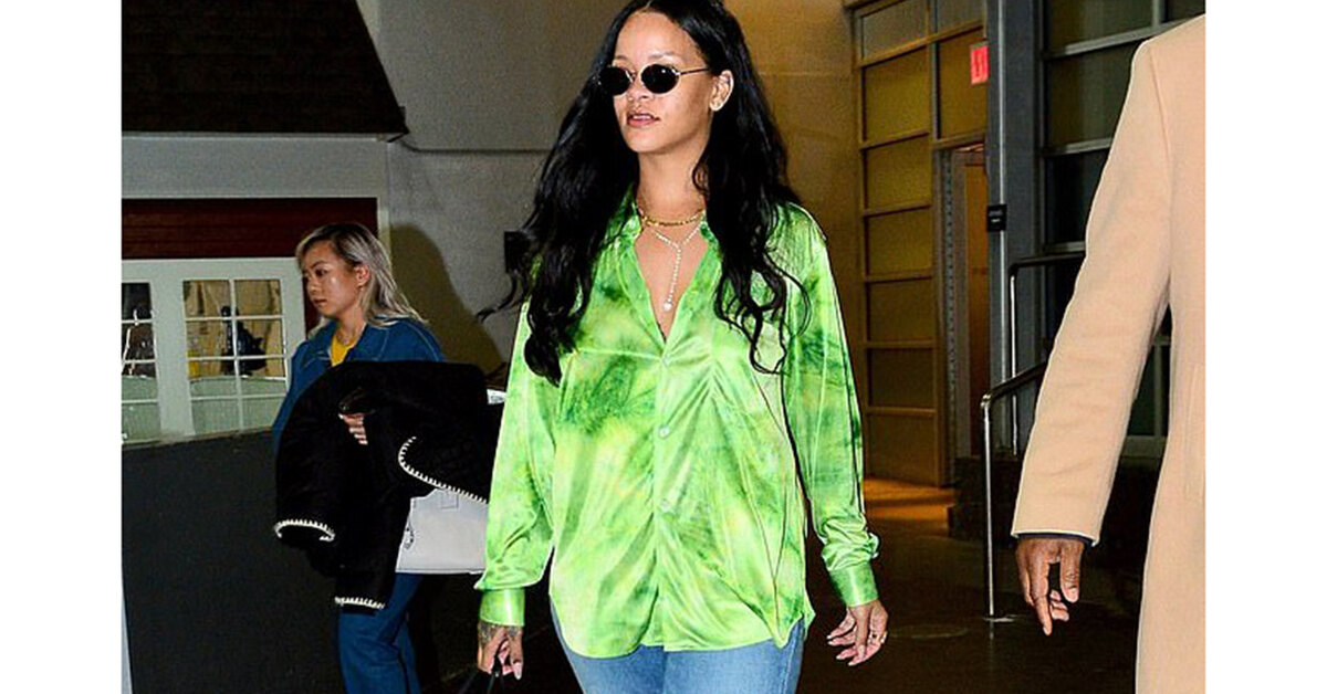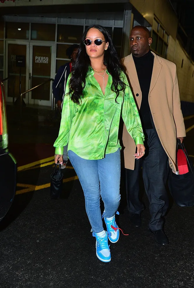 Рианна обожает кричащие оттенки и часто выбирает для выходов в свет броские наряды, подчеркивающие ее формы. Однако на этот раз поп-диве удалось одеться довольно скромно, не отказавшись при этом от любимого неона: она выбрала для выхода джинсы скинни из классического синего денима, которые дополнила высокими сине-белыми кроссовками и свободной шелковой рубашкой неоново-зеленого цвета. Образ завершили овальные солнцезащитные очки и изящные украшения на шее. Просто, но очень выразительно!
