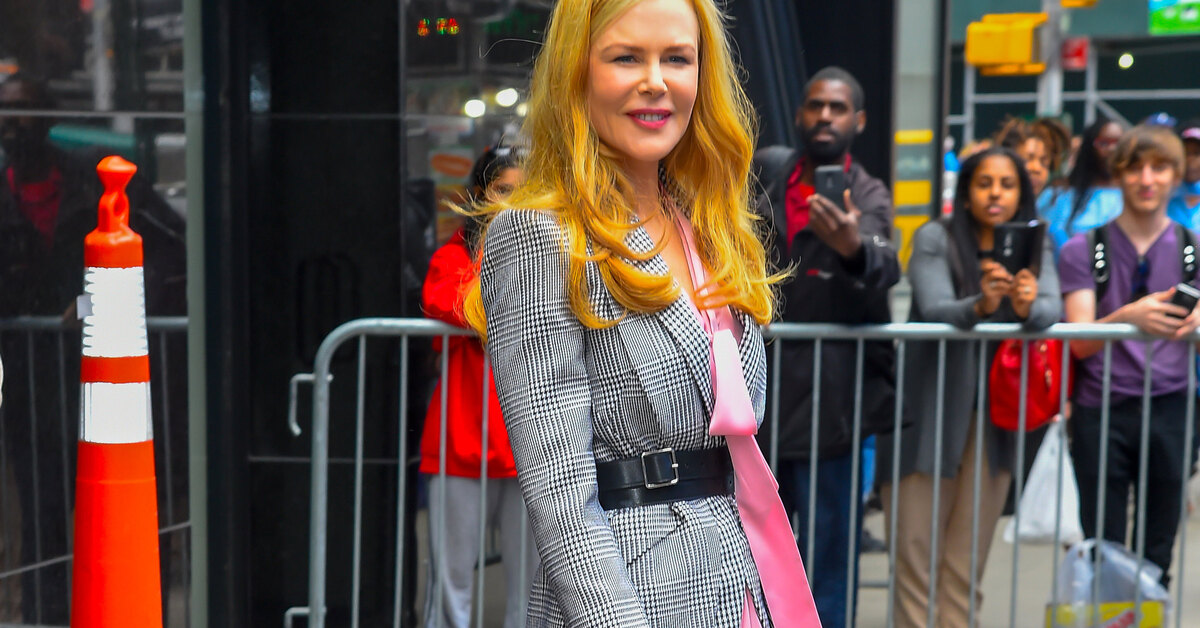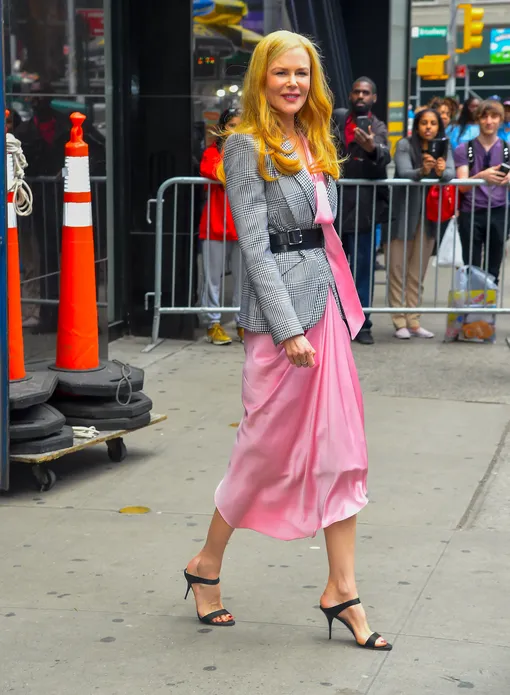 До выхода нового сезона сериала «Большая маленькая ложь» остались считаные дни, о чем вчера в эфире телевизионного шоу Good Morning America напомнила исполнительница одной из главных ролей Николь Кидман. Для визита на ТВ стилисты подобрали актрисе образ в самом актуальном цветовом сочетании сезона: нежно-розовое шелковое платье с бантом и асимметричным подолом дополнил строгий серый жакет в клетку гленчек. Талию подчеркнул широкий черный пояс, а финальным штрихом стали босоножки на каблуке-рюмке. Безупречно!
