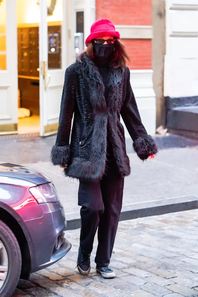 Носите черную шубу с яркой «зимней» панамой, как Белла Хадид