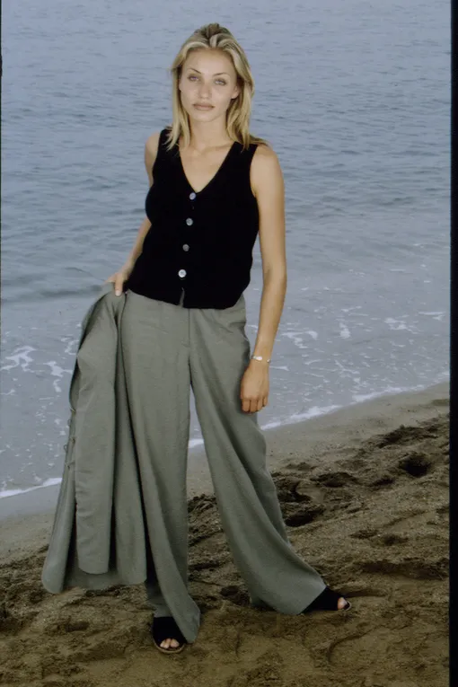 Образы юной Диаз — воплощение минимализма 90-х. Простой крой, ахроматические оттенки и никаких лишних деталей. Звучит примерно как любой актуальный лук сегодняшней звезды стритстайла, ведь все эти элементы в моде прямо сейчас. Итак, берем простой серый брючный костюм (вариант от LVIR — практически точное попадание в первоисточник), очень модный сейчас трикотажный жилет (мы взяли топ на пуговицах Pinko — вышло даже острее) и сандалии с открытой пяткой (нет ничего лучше и удобнее классических Birkenstock — советуем выбрать именно их). Трендовый лаконичный образ готов! Меняем сандалии на лоферы и добавляем вместительную сумку-тоут или хобо — и можно смело идти на работу. А лодочки и изящный клатч в руке станут лучшими друзьями этого лука на свидании в ресторане. В общем, вы будете выглядеть уместно в любой ситуации. А что еще нужно в нынешние сложные времена, если не простота и понятность?