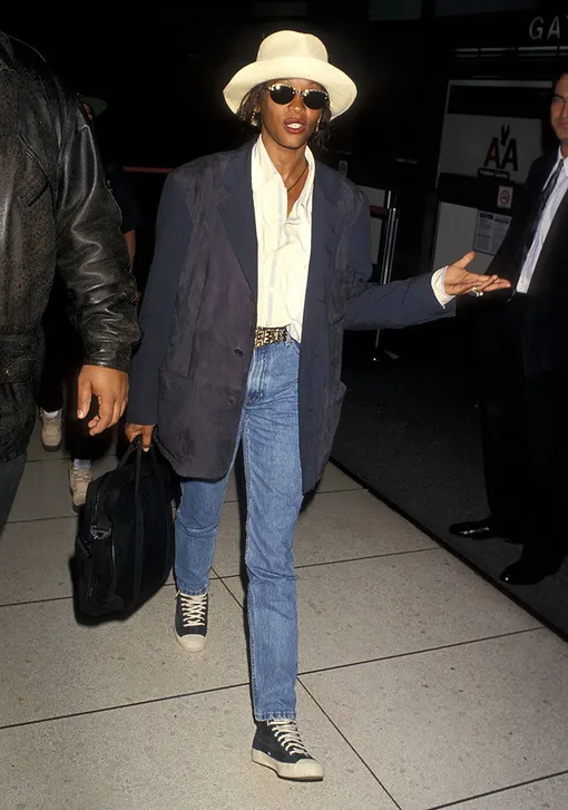 Комбинация белой рубашки, синих джинсов и «мужского» жакета — классика жанра, которая не исчерпает себя никогда. Актуальность этого комплекта доказывает Уитни Хьюстон, которая в 1994 году была запечатлена в аэропорту именно в таком комбо. Более того, певица добавила к образу ультрамодную панаму bucket hat и кеды. Черпаем вдохновение!