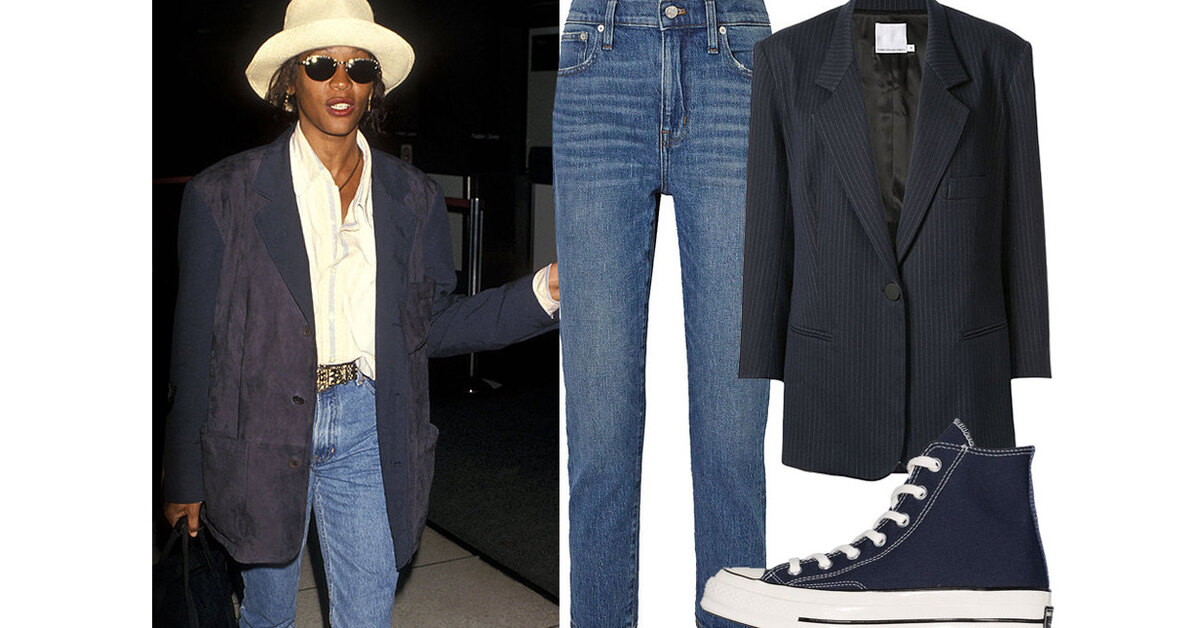 Комбинация белой рубашки, синих джинсов и «мужского» жакета — классика жанра, которая не исчерпает себя никогда. Актуальность этого комплекта доказывает Уитни Хьюстон, которая в 1994 году была запечатлена в аэропорту именно в таком комбо. Более того, певица добавила к образу ультрамодную панаму bucket hat и кеды. Черпаем вдохновение!